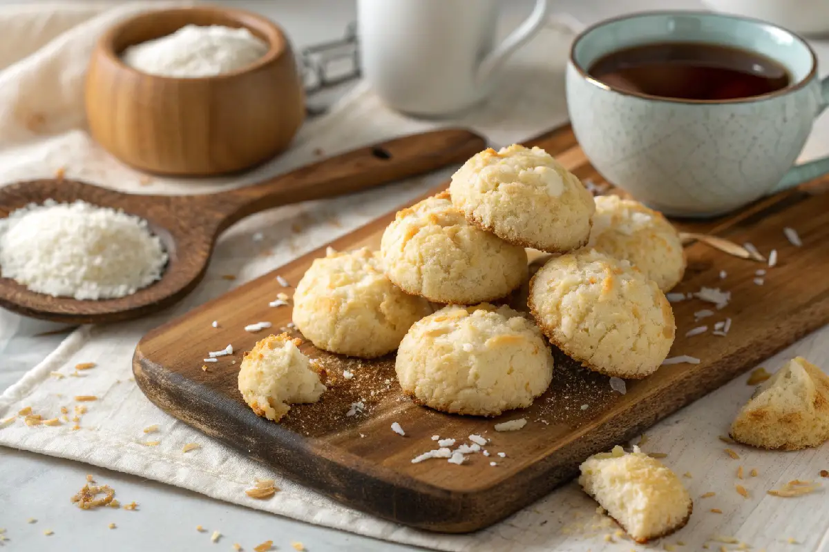 Biscoitinhos de coco crocantes por fora e macios por dentro, assados rapidamente para um chá perfeito. Massa simples com coco ralado que derrete na boca.