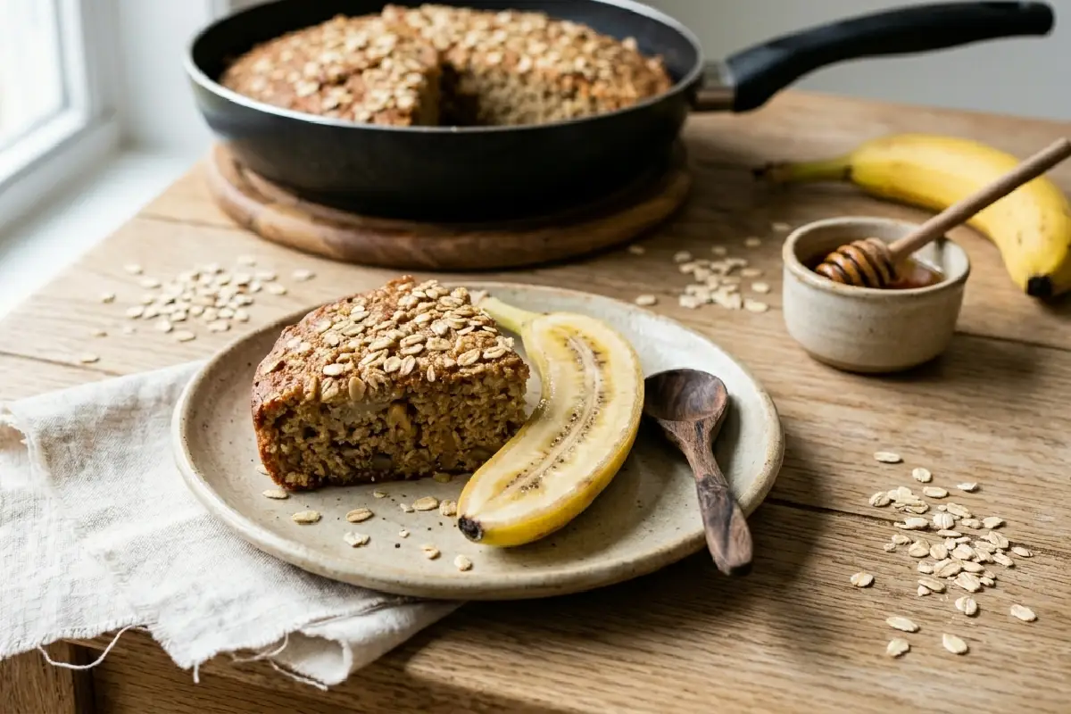 Um bolo leve e nutritivo feito com banana, aveia e iogurte, preparado diretamente na frigideira — sem forno, sem açúcar…