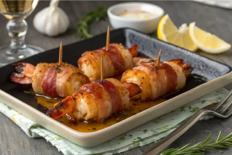 Resumo RápidoCamarão enrolado no bacon crocante por fora e suculento por dentro, caramelizado no mel e regado em molho cremoso de alho. Petisco gourmet frito