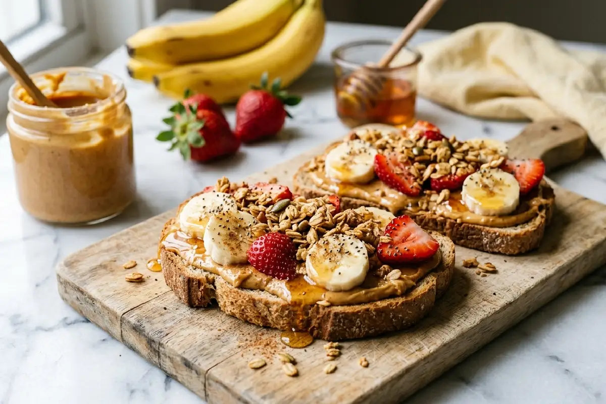 Fatias de pão integral tostado com pasta de amendoim cremosa, banana, morangos, granola e fio de mel — café da manhã nutritivo, prático e absolutamente irresistível.