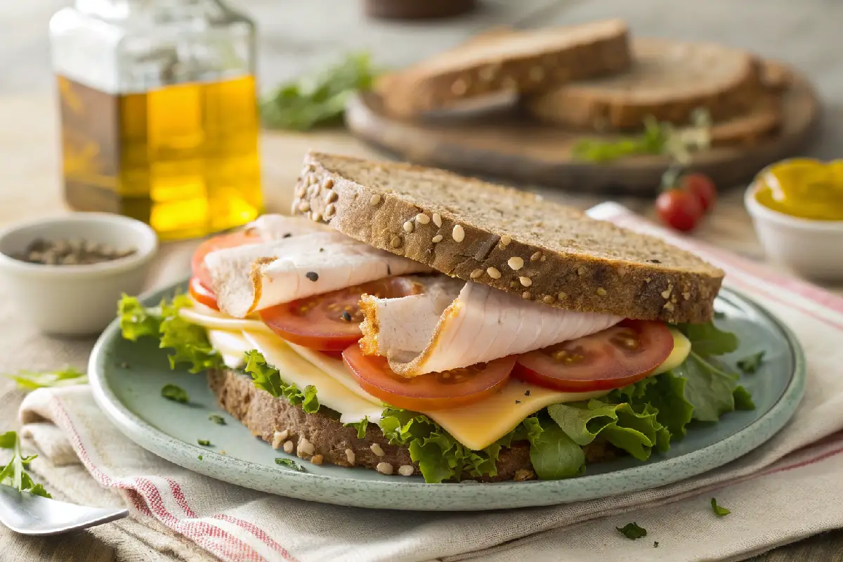 Sanduíche de peito de peru saudável, com ingredientes frescos e pão integral, ideal para lanches rápidos e nutritivos.